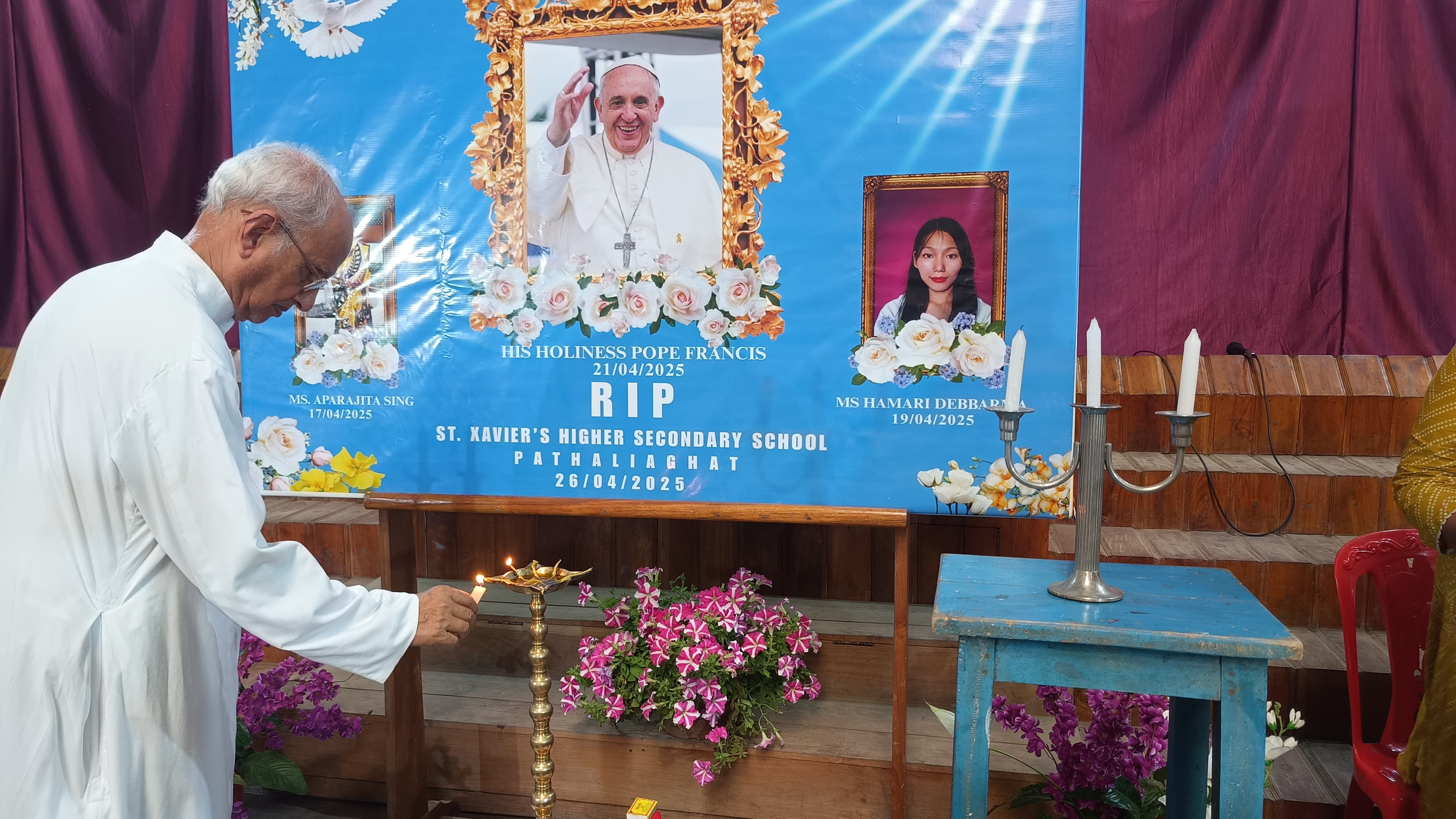St. Xavier’s Higher Secondary School held a heartfelt condolence programme on 26th April 2025 in memory of three dearly departed souls: His Holiness Pope Francis, Ms. Aparijita Sing (a dedicated teacher of the school), and Ms. Hamari Debbarma (beloved daughter of the school’s librarian). The programme was organized in the school hall and commenced at 9:00 AM. Ms. Priyanka Debbarma opened the ceremony with a short yet moving introduction that set a solemn tone for the gathering. This was followed by a prayer led by Bro. Augustine, which brought a sense of peace and reverence to the atmosphere. The ceremonial lighting of the lamp and candle added a touch of grace and serenity, symbolizing the light these individuals brought into the lives of others. Fr. Babu Stephen, the Principal, extended a warm welcome to all in attendance and emphasized the significance of the programme, reminding everyone of the values and inspiration each of the departed had imparted to the school community. Fr. K.K. Joseph, the Rector, spoke at length about the life and legacy of Pope Francis, highlighting his humility, compassion, and global impact. Ms. Ratna shared touching memories of Ms. Aparijita Sing, celebrating her dedication and love for her students. Ms. Priyanka Debbarma then spoke about Ms. Hamari Debbarma, remembering her joyful spirit and the love she brought to those around her. The school band’s moving performance of the hymn "Abide With Me" deeply touched all present, adding a layer of emotional depth to the occasion. The entire programme was a meaningful tribute, beautifully organized to honour the lives and contributions of those who are no longer with us. The condolence programme was a reminder of the strength of community, the beauty of remembrance, and the enduring impact of love and service.